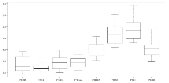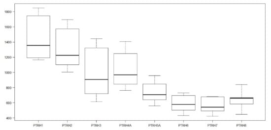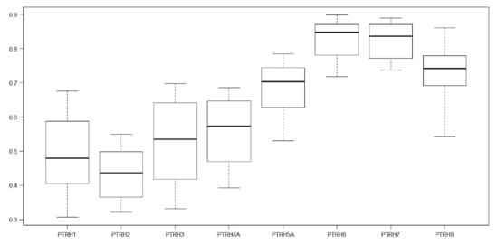 In the WYM, precipitation and actual evapotranspiration are related to the spatial distribution of meteorological factors and land cover types [32]. The boxplots in Figure 4 show the average annual precipitation by river basin district (RBD). The value is maximum (1850 mm) in the RBD (PTRH1) located in the northwest coast of the country, where the high elevation in the coastal zones contributes to the development of convective systems that promote the occurrence of precipitation events [23]. The minimum value (less than 500 mm) is in the PTRH8 district in the south of Portugal, where are located the most vulnerable regions to drought events, being observed the lowest precipitation indices and the highest temperatures [11].