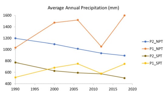 Figure 5 is showing plots of the average annual precipitation (P1—WorldClim; P2—SNIRH) in the study years (1990, 2000, 2006, 2012 and 2018), by these 2 sectors, P1, P2 for NPT (North of Portugal) and P1, P2 for SPT (South of Portugal).