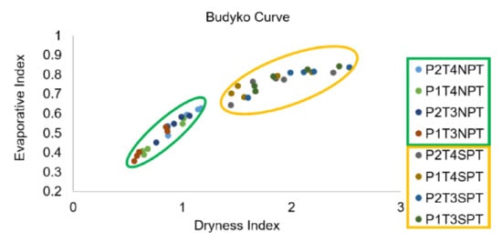 Examining the Budyko curve with mean values of DI and EI of the five studied years, is possible to distinguish two main clusters referring to these two sectors, NPT (North of Portugal) and SPT (South of Portugal). As water yield is greater in those points close to zero, the cluster formed by points from the NPT sector show better water availability, with the greatest value in the simulation T3 using P1 and E1, and for the SPT sector, with test T4 using P2 and E2.