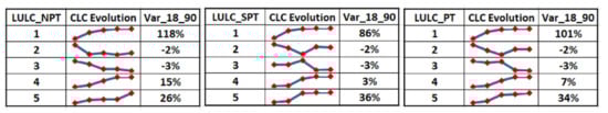 Analyzing the land cover changes in national scale (LULC_PT) in the five main Corine Land Cover categories between 1990 and 2018, the numbers show that artificial areas have increased more than 100%, followed by surface water bodies and wetlands, with 34% and 7%, respectively. Agricultural, and forest and semi-natural areas have decreased by 2% and 3%, respectively. The studied categories followed the same pattern in the NPT and SPT sectors (LULC_NPT; LULC_SPT).
