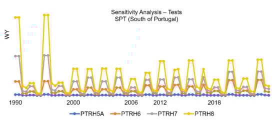 Sensitivity analysis provides a logical and verifiable method of optimizing the distribution of resources used to determine the most important parameters [46]. Considering the spatial pattern established by the meteorological outcomes, this step began investigating the sensitivity of the WYM outcomes by sectors NPT (North of Portugal) and SPT (South of Portugal), assessing and comparing the model’s performance over sensible ranges to determine the effect of these variations. Figure 10 shows water yield result of each test by RBD for NPT sector. The year 2006 has only 8 estimated WY values because Z1 was equal to Z2.