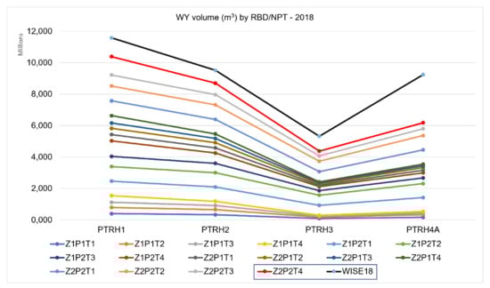 Estimated WY volume (m3) in 2018 by RBD/SPT sector and observed values.