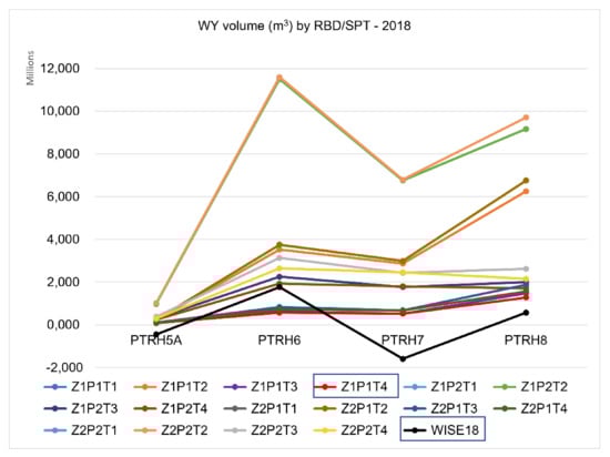 The most convincing evidence that a scientific theory or model is correct is through direct comparison of model predictions with experimental observations [46]. The Waterbase [29] hosted at the European Environment Agency (EEA), provides a central access point to several data based on reporting from countries as part of implementation of EU directives. The validation dataset contains the volume of freshwater resources by RBD for 2018, that will be compared with the best simulations for the same year. Thee data are available for download in the Supplementary Materials section (Validation_WY_2018.xlsx). Figure 12 presents the estimated volume of water yield in 2018 by RBD of the North of Portugal and the observed volumes (WISE18). The best performance simulation in this year was Z2P2T4 which is marked in the legend of the image.