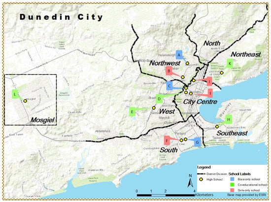 This study was part of the Built Environment and Active Transport to School (BEATS) Study conducted in Dunedin, New Zealand []. The study site was Dunedin city, which is located to the southeast of the South Island of New Zealand. Dunedin is the 6th major city (in population and land area) in New Zealand and the 2nd largest in the South Island. This coastal city was built around a natural harbour, having many hilly suburbs and surrounded by hilly topography. The total area of Dunedin is around 3314 km2 (255 km2 urban area), with the population at approximately 128,800 at the time of data collection of BEATS study. The average temperature of Dunedin varies from 6 degrees in the winter to 17 degrees in the summertime, with an average of 806 mm of annual precipitation. In New Zealand, students start enrolling at school at age 5 (Year 1). There are 12 high schools in Dunedin, with half of the schools providing education from Year 7 (age 11) to Year 13 (age 18) and the other half starting at Year 9 (age 13). Among the 12 surveyed schools, there were 5 co-educational high schools (1 private school), 3 boys-only high schools (1 private school), and 4 girls-only high schools (2 private schools from Year 7 to 13).
