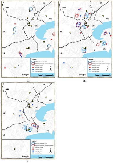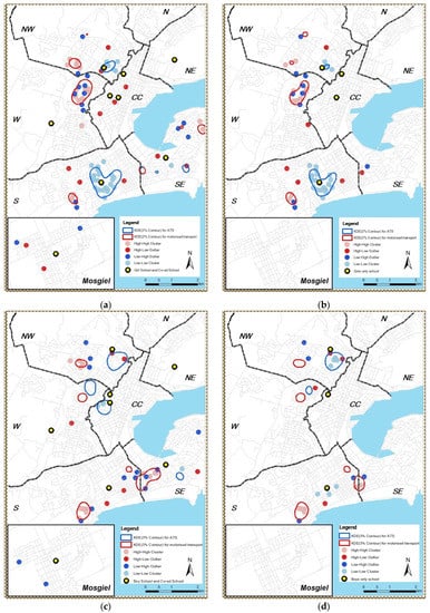There were large spatial overlaps between female ATS users (Figure 2a) and girls-only school attending ATS users (Figure 2b) in the south of the city. This particular result indicates not only that female ATS users and girls-only school attending ATS users lived close to each other, but potentially also attending girls-only school was connected to these female ATS users in the south of the city (i.e., a local, not global relationship of the kind this spatial study is trying to reveal). A similar spatial association was found with male ATS users (Figure 2c) and boys-only school attending ATS users (Figure 2d) in the northwest of the city. In terms of MTS usage, the distributions of female and girls-school attendees in the northwest, west, and south of the city were similar, while the distribution of male and boys-school attendees was also considered similar with the only exception located along the border dividing south and southeast zones of the city.