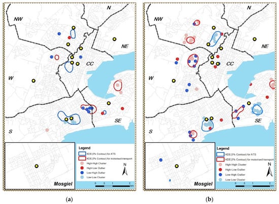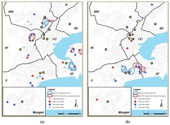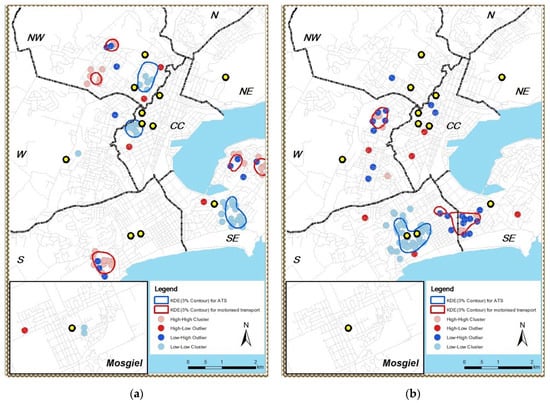 KDE and LISA transport modes distribution on residential density: (a) medium home neighbourhood residential section density; (b) high home neighbourhood residential density.