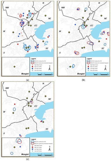 Figure 8 summarises the distribution of both KDE and LISA spatial patterns. The summary includes the spatial pattern distributions in seven zones of the city and the medium urban area Mosgiel. Spatial patterns for both ATS and MTS were mainly observed in the southeast, south, west, and northwest of the city. There was no pattern observed in the north and northeast of the city. The spatial coincidence of distribution between the transport modes used and the distribution of the ATS factors across the city was also highlighted in Figure 8. For example, there were matching results between KDE and LISA in terms of male ATS users in the south (matching KDE results of ATS with LISA result of Low-Low cluster) while female ATS usages in the southeast.