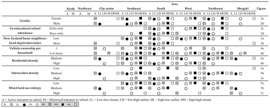 Active transport (e.g., walking and cycling) has a wide range of benefits on the urban environment, health and wellbeing, social and health equity []. Active transport to school (ATS) is a convenient way for adolescents to reach their recommended daily physical activity level, which is important to promote health and mitigate cardiovascular risk in later life [,,,]. ATS can also lead to a more environmental and economically sustainable travel behaviour over a lifetime []. Previous non-spatial findings reported either one of the genders to be more likely to use ATS [,,] or no association between ATS and gender [,,]. Home-to-school distance is one of the strongest predictors of adolescents’ use of ATS [,,,,]. Home income status is negatively related to adolescents’ ATS rates [,,,,,,,]. High intersection density was found as both an ATS barrier due to safety concerns [,,,,] and an ATS enabler due to better street network connectivity [,,,,]. Higher residential density was also a positive correlation of ATS in adolescents [,,,]. Some previous studies reported higher land-use diversity was positively associated with ATS usage [,], while some other studies reported either a negative [] or insignificant [] association.