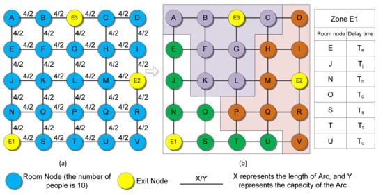 The principle of the partitioned and staged evacuation planning. (a) Multi-exit route network model; (b) evacuation zones and delay time.
