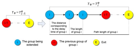 According to Equation (4) and the principle of “first in first out, second delay” [36], the evacuation time of each zone is determined by the evacuation time of the group with the longest path length in each zone. Dijkstra algorithm is used to determine which group in the zone is the group currently extended. The evacuation time of the group is the current evacuation time of this zone. As the zone is expanded, the current evacuation time of the zone is updated accordingly. When the last group is extended, the evacuation time of the group is the final evacuation time of the zone. According to Equation (6), the evacuation time of the last group extended in the current zone is taken as a function of the occupancy time of each exit for expansion, which includes the delay time and travel time of the group. The travel distance of the group consists of the length and path length of the group (Figure 2). Then the exit with the minimum occupancy time should be chosen to expand its evacuation zone each time. Finally, the process of evacuation partitioning based on time equalization is finished. The function of is