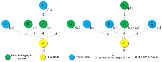 The expansion results partitioned by the group merging strategy are shown in Figure 3b. When node A is extended, the evacuation time of group A is actually the evacuation time of group D because group D is merged by node A. The continuity of groups will not increase the evacuation time of the current zone. So, the evacuation time of group D can be used as the occupancy time of the exit e. The PSEP algorithm can also use the group merging method to solve the problem of the lack of local information on buildings. It only needs to add the population on branch nodes to their own trunk node.