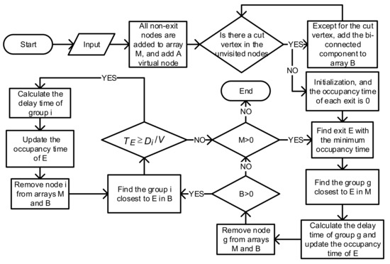 where, denotes group in zone . If the delay time of the group is less than 0, it is set to 0. If , it means that group and group are evacuated end-to-end. The simultaneous evacuation strategy uses the following equation to calculate the evacuation time of group .