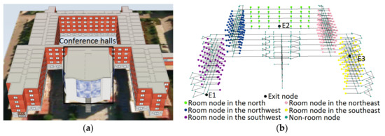 The PSEP algorithm adopts the partitioned and staged evacuation strategy to evacuate occupants with high population density, but takes no consideration of the density and spatial distribution of occupants and the capacity of exits. In fact, these factors have a great impact on evacuation efficiency. Accordingly, the density and spatial distribution of occupants are simulated by setting the room nodes with different sizes as the source nodes. Three exits, E1, E2, E3, are set in different capacities, respectively. It is assumed that the capacity of arcs is 9 person/s. The experimental route network model has five floors, and each floor is divided into five types of room nodes in different directions: southwest, southeast, northwest, northeast, and north. As shown in Figure 5a, there are mostly conference halls and bathrooms in the south, where the density of occupants is small, so they are treated as intermediate nodes. This is more conducive to the study of the impact of the uneven spatial distribution of occupants on evacuation efficiency.