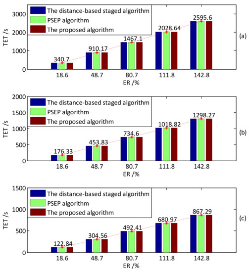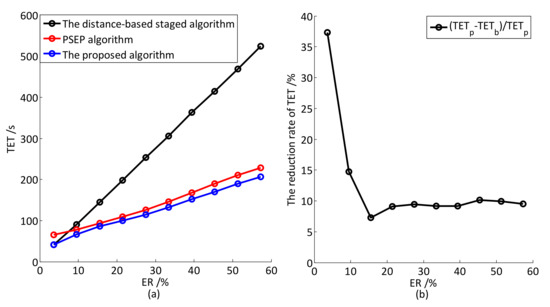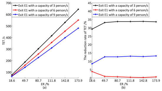 Comparison of the relationship between ER and TET at different capacities of exit E1. (a) The TET of the proposed algorithm with different ERs; (b) compared with the PSEP algorithm, the reduction rate of TET of the proposed algorithm.