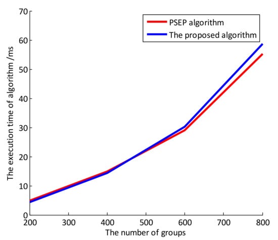 The efficiency of the proposed algorithm and the PSEP algorithm is compared in Experiment 2. The number of groups is set to be 200, 400, 600, and 800, respectively. Adding the sink node E1, the number of the total nodes of the corresponding route networks will be 201, 401, 601, and 801, respectively. The size of groups is set to a random number among (5,20), and the escape speed is fixed at 3 m/s in the experiment. The results are shown in Figure 7.