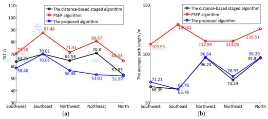 Comparison of evacuation efficiency by three strategies in the condition that the distribution of occupants is different. (a) TET of three algorithms; (b) the average path length of three algorithms.