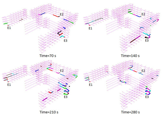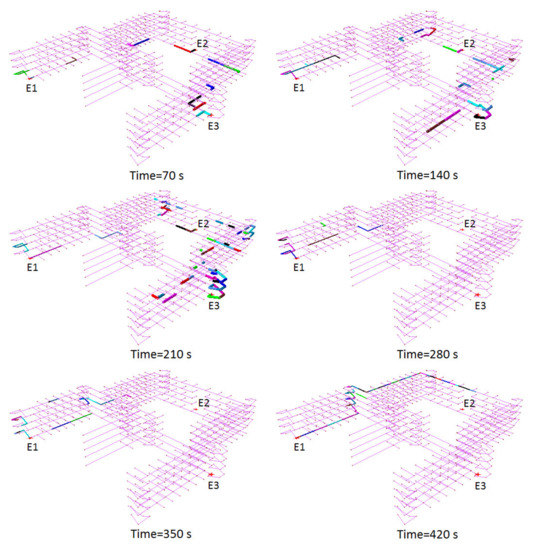 The visual simulation process of the PSEP algorithm is shown in Figure 11. It is assumed that the start time of evacuation is 0. All occupants in zones E2 and E3 already have completed evacuation after 280 s. However, some groups on floor 5 still have not left safety exits after 420 s. Therefore, the evacuation strategy planned by the PSPE algorithm under this condition is not optimistic. By comparison, the strategy of the proposed algorithm makes all groups complete evacuation after 300.28 s, as shown in Figure 12. If the capacity of exits is considered, the evacuation time of the three zones is still almost equal. The proposed algorithm improves the utilization rate of exits and greatly reduces the evacuation time. On the whole, the proposed algorithm is better than the other two staged evacuation algorithms, which provides a new method for indoor emergency evacuation.