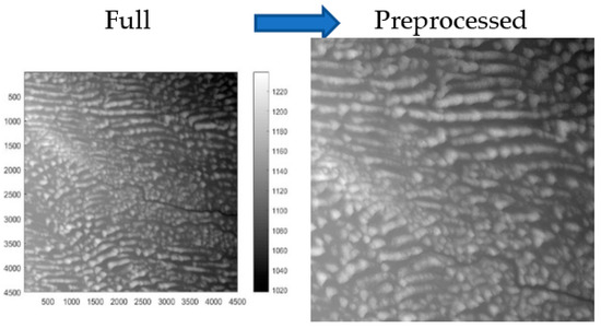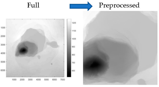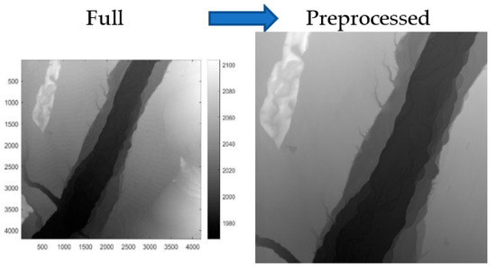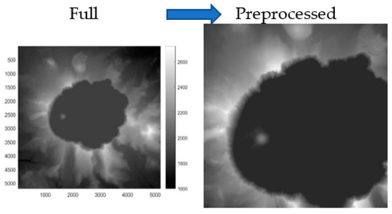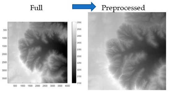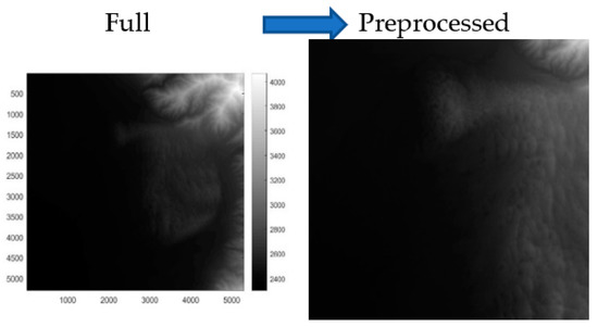 To show and compare different terrain modeling methods in a straightforward manner, we chose a publicly available collection [64] of single-scale elevation models of representative landforms as our experimental datasets. These HRDEMs of archetypal landform types are derived from the United States Geological Survey (USGS) 3D Elevation Program (3DEP) LiDAR sources with resolution ranging from 2 to 10 m. The six archetypal landform datasets include an eroded plateau (Bryce Canyon, UT, USA, Figure 1, Full), a volcanic caldera (Crater Lake, OR, USA, Figure 2, Full), active sand dunes (Great Sand Dunes, CO, USA, Figure 3, Full), a braided riverbed (Jackson Hole, WY, USA, Figure 4, Full), a shield caldera (Kīlauea, HI, USA, Figure 5, Full) and stabilized sand dunes (Sandhills, NE, USA, Figure 6, Full). The datasets are intercepted and made into the same size DEM of 1000 1000 by downsampling DEMs with medium interval from above DEMs. Then, these six classes of datasets are normalized, as shown in Formula (1), shown as preprocessed DEMs in Figure 1, Figure 2, Figure 3, Figure 4, Figure 5 and Figure 6. Finally, we obtain 500500 LRDEMs by downsampling DEMs with medium interval from 10001000 DEMs. These 500500 preprocessed datasets are obtained as experimental DEMs, the detailed information about which is shown in Table 1.