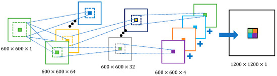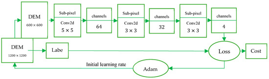 The specific process of the algorithm is as follows: LRDEM data are used as the input data into the network, which enter into the three sub-pixel convolutional layers using rectified linear unit (ReLU) as activation function. After entering into the first sub-pixel convolutional layer with kernel 4 × 4, the datasets will turn into 64-channel datasets. Then, second sub-pixel convolutional layer with kernel 3 × 3 finally outputs 4-channel datasets, which means that the length and width of the DEM grid data increases by one time, respectively. The self-adaptive learning rate Adam [65] algorithm is used to optimize the model. The specific structure of our method is shown in Figure 7. The process of the data formation is shown in Figure 8.
