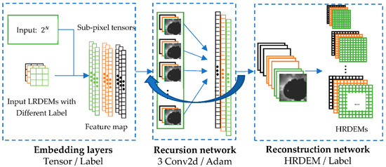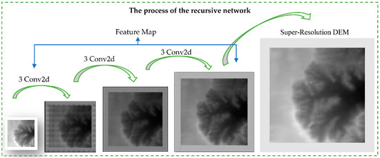 Based on ESPCN, the proposed RSPCN model is presented by introducing the idea of recursion. The network is outlined in Figure 9, containing three sub-networks: embedding, recursion and reconstruction networks. The embedding network is used to generate feature maps from LRDEMs. Next, the recursion part finishes the SR part. After this, final feature maps in the recursion part are fed into the reconstruction network to generate the output HRDEMs.