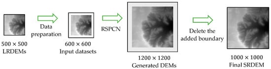 During the convolutional layers, the boundary pixels of the DEMs cannot be convoluted. The reason is that the boundary pixels cannot completely overlap the convolution kernel. For example, the edge of one pixel will not be processed with a kernel 3 × 3. Therefore, we add “zero” (representing value = 255 in the gray picture) to the boundary of the DEMs. In the results, we will delete the “zero” boundary of the generated DEMs and finally obtain the SRDEMs to do the comparison and analysis. The specific data processing steps are as follows.
