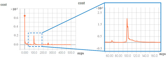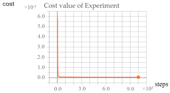 When the chosen Adam’s initial learning rate is unsuitable, we use No. 1 training datasets with the DA process to increase the stability and accuracy of the algorithm. When the selected parameter makes the algorithm converge in an efficient way (such as in Table 3), the No. 2 training datasets could be chosen to reduce the training time consumption. Thus, we choose the experiment with No. 2 training datasets and . With the number of training steps set up as 10,000, the loss function curves of the model in the training process are shown in Figure 12, showing that the loss function is fast converging. During the training process, the cost goes down from to . After about 400 training steps, the network finds the distribution characteristics of the terrain by deep learning.