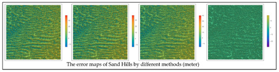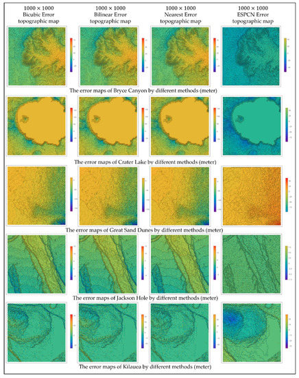 According to Table 5, it can be seen that the RSPCN method performs better when facing different terrain types than the other traditional interpolation algorithms, with more PSNR values higher and more RMSE values smaller. As for Kilauea (shield caldera), although the PSNR and RMSE values are not the best, those of our method are very close to the best ones. These four methods all perform well regarding the SSIM index (close to 1). As for the bicubic interpolation method, the PSNR and RMSE values of the Jackson Hole DEM data perform best among the three traditional methods. As for the nearest-neighbor interpolation method, the PSNR and RMSE values perform better except for Jackson Hole than those of the other two traditional methods. As for the bilinear interpolation method, its results are similar to those of the bicubic interpolation method, but it does not perform well for Jackson Hole DEM data and Sand Hills DEM data. However, the evaluation index values of the three traditional methods are very close to each other and only have slight differences. The accuracy of the RSPCN model becomes higher every step during the training process, while other traditional interpolation methods could not improve the precision by learning. Therefore, the RSPCN algorithm has some advantages in improving the accuracy of the DEM interpolation. The error maps of the generated SRDEMs of different terrain types are shown in Figure 13. For each test site, the color bar scaling of the errors is the same among different methods. From Figure 13, compared with other methods, it can be seen that our method has smaller maximum error values except for the Kīlauea terrain, which could effectively reconstruct the SRDEMs.