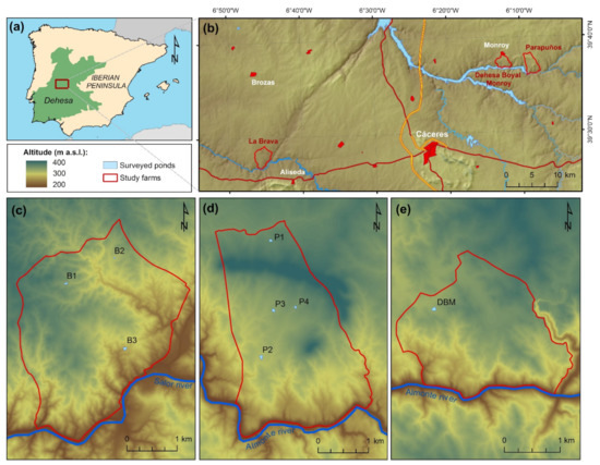 Throughout the study farms, several ponds were selected in which the water depth was low enough to allow point collection by wading: P1, P2, P3, and P4 at Parapuños farm; B1, B2, and B3 at La Brava farm; and DBM at Dehesa Boyal Monroy farm (Figure 1c–e).