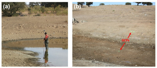 On the other hand, the characteristics of livestock watering ponds in the SW Iberian Peninsula (size, water depth, and turbidity) make unsuitable the use of technologies commonly used to survey submerged areas, such as bathymetric green airborne LIDAR [21], bathymetric sonar on manned boat [22], or through-water TLS [23]. Nonetheless, the rapid development in recent years of low-cost mobile platforms such as unmanned aerial vehicles (UAVs) and unmanned surface vehicles (USVs), with increasing use in surveying applications, is making it possible to solve many of the drawbacks associated with traditional surveying techniques in the presence of shallow and turbid waters. For example, a small unmanned vessel can be equipped with a bathymetric sonar to survey the submerged terrain [24], while the emerged areas can be surveyed using UAV photogrammetry [25,26,27,28,29].