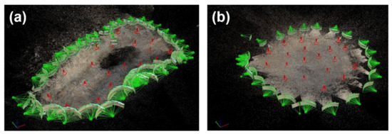 Convergent image network geometry (every camera pose is shown in green), sparse point cloud, and GCPs (in red) for (a) pond B1 and (b) pond B2.