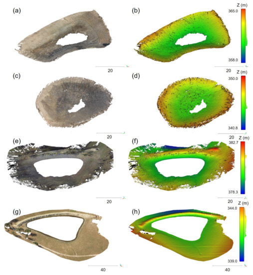 Point clouds showing the RGB values and elevation for B1 (a,b), B2 (c,d), P4 (e,f), and DBM (g,h). Note that B1 and B2 were surveyed using terrestrial SfM-MVS photogrammetry, P4 was surveyed by means of TLS, and DBM was surveyed using aerial SfM-MVS photogrammetry. Scale bars = 20 m for (a–f) and 40 m for (g,h).