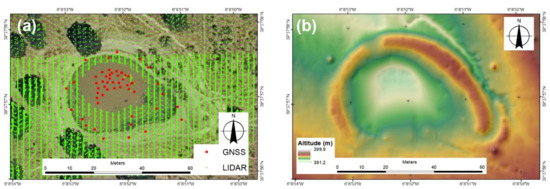 Watering ponds P1, P2, P3, and B3 were surveyed using the GNSS in RTK mode for the submerged surface, while the emerged topography was obtained from the LIDAR dataset provided by the Spanish National Geographic Information Centre [17] (e.g., Figure 5). This dataset shows a point density of 0.5 pts·m−2 and was acquired using a Leica ALS50 sensor. Both point datasets were merged together and then the topographic surface was modelled using the interpolation algorithm topo to raster [65] within the ArcGIS software (10.5), producing a DEM for each pond with a pixel size of 0.5 m (Figure 4b). Additionally, five points were recorded with the GNSS RTK system and performed as CCPs in order to evaluate the accuracy of the resulting DEMs (i.e., these points were not used in the production of the DEM). This quantification includes the error of the instrument techniques (i.e., LIDAR and GNSS) and the interpolation technique (i.e., the topo to raster algorithm).