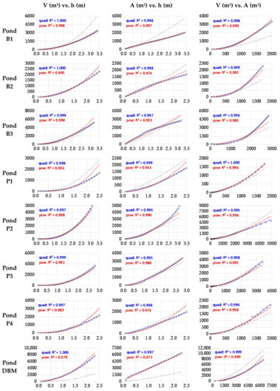 In order to obtain generalized V–h, A–h, and V–A relationships that may be used at the regional scale, the values of V, A, and h (obtained every 10 cm depth) from all study ponds were represented together and fitted equally by means of power and quadratic functions.