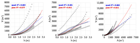 Generalized V–h, A–h, and V–A relationships that resulted from fitting power functions (red lines) and quadratic functions (blue lines) to the DEM-derived V and A values (black dots) of all ponds.