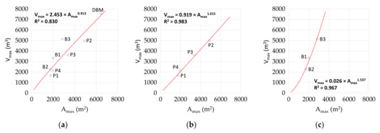 Figure 8a presents the generalized Vmax–Amax relationship derived from the Vmax and Amax values of the study ponds, expressed by the following equation:
