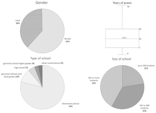 The survey was aimed at primary and secondary school geography teachers in the Czech Republic. The first questions asked about the gender (Q28) and experience of the respondents (Q27). The average number of years of praxis was 17.2 years (median 16 years). According to the annual report of the Czech School Inspectorate [9], teachers’ average length of praxis in 2019 was 19.7 years. The next questions asked about the type (Q25) and size (Q26) of the school where the teachers worked (Figure 1).