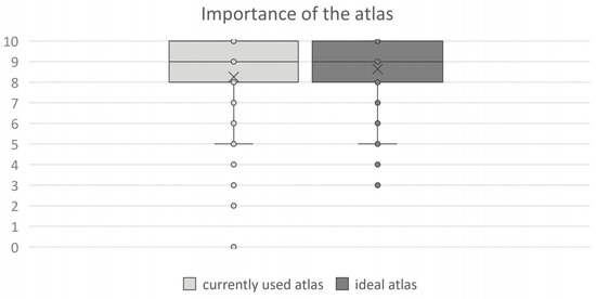 A comparison of the responses to Q1 and Q24 depicted in Figure 2 shows that the hypothetical atlas “according to the teachers’ ideas” would have only slightly higher importance than the currently used atlas.