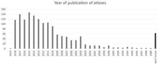 The age of used school atlases was addressed in Q4. Surprisingly, 10% of teachers responded that they did not know the answer. This question was conceived as open-ended, and teachers, therefore, often provided information in the form of text. Analysis of the answers to this question was therefore difficult, and some uncertainty in processing may have been present in many respects. Each teacher’s responses were checked, and the textual information was converted into numbers. Ideally, teachers indicated the specific year of publication of the atlas. A large number of responses contained several dates (i.e., most atlases 1989, several 2004). In this case, the data for both responses were included in the analysis (1989 and 2004). Many teachers also mentioned the range of years (i.e., 2012–2015). In this case, all the years in the specified range were included in the analysis (2012, 2013, 2014, and 2015).