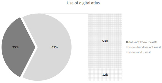 Questions Q14 and Q15 focused on the issue of digital versions because all three existing atlases were also available in this form. In the atlas from Kartografie PRAHA, the maps are available in the form of an electronic book in Flexibooks format. In addition to zoomable maps, this version also contains some multimedia elements such as images, graphs, and video links. The other two atlases offer a very similar solution. In all cases, the digital version is more a set of zoomable variants of analogue maps than a fully interactive publication. In Q14, teachers were asked whether they knew that an electronic version existed. Almost two-thirds of teachers (65%) answered yes. However, contrary responses on whether teachers used this electronic version were given to Q15 (Figure 6). Only 12% of teachers who knew about the digital version actually use it. Specifically, this was 72 teachers.