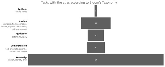 The second research question focused on the tasks that students solve with atlases. It was found that teachers often work with thematic maps, which they also consider the most important component in atlas content. The vast majority of maps are used for simple tasks such as finding specific information. However, many teachers work with thematic maps in a sophisticated manner. Students compare multiple thematic maps with or the relationships between thematic and physical maps. One of the most frequently mentioned tasks was working with blank maps, even though blank maps are not part of the atlases. The most popular tasks among students are searching, crossword puzzles, and competitions. By contrast, tasks for determining geographical location, finding context, and analytical tasks, in general, are unpopular. In the classification of tasks according to Bloom’s taxonomy, it was found that the vast majority of tasks belong in the first category (knowledge). The most common task is simply to find information on the map. This result agrees with the findings of Sandford [3], who stated that atlases are mainly used as gazetteers. Other categories were represented only in a minority of the responses, which suggests that the potential of school atlases is not fully exploited. The above findings show the prevalence of the commemorative teaching style, but it does not develop students’ geographical thinking.