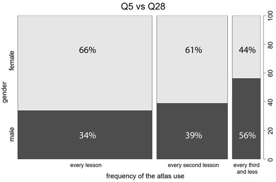 A modified chi-square test [12] was used to verify the homogeneity of answers when the combination of the nominal and ordinal questions was investigated. Ordinal answers were available for questions Q5, Q22, Q26, and Q27. An example is the analysis of the relationship between Q28 (gender) and Q5 (frequency of atlas use). In this case, it was tested whether the relative distribution of answers to the question of atlas use frequency was the same for males and females. Based on the test results, it was found that the structure of responses differed between male and female teachers (p < 0.001). Figure 10 shows that this difference was caused mainly by the frequency of selection of extreme variants of Q5. While 66% of female teachers are among those who work with the atlas every hour, the option “every third lesson or less often” was selected predominantly by male teachers (56%). It can be said that female teachers tend to work with the atlas more often than male teachers.