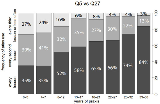 One of the most important results was found in the relationship between Q27 and Q5 (the frequency of atlas use). Teachers with fewer years of praxis use the atlas less often than their more experienced colleagues (or less than expected in the case of the independence of both questions; p < 0.001). This trend is visible in the graph in Figure 11.