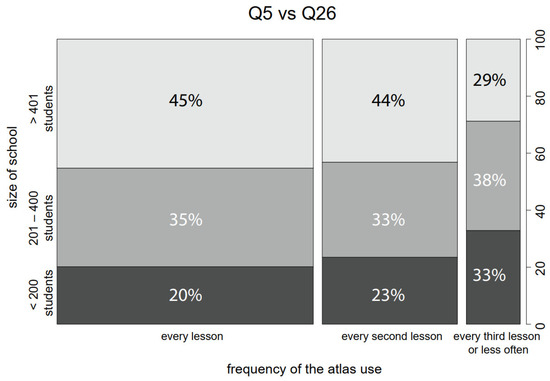 One of the key questions in the survey was the frequency of atlas use (Q5). As mentioned above, it was found that women work with the atlas more often than men and rather more experienced teachers than novices. A significant trend appeared concerning Q26 (the size of the school). It can be seen in Figure 13 that teachers from larger schools tend to work with atlases more often than those from smaller ones (Q5 vs. Q26; p = 0.008).