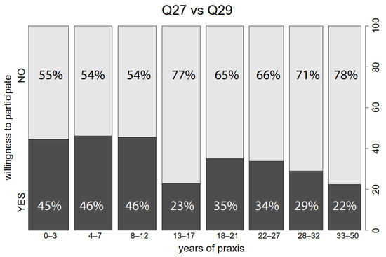 The willingness to participate is also influenced by the number of years of praxis (Q27 vs. Q29; p < 0.001). Higher interest in participation can be observed in the first three categories of years taught (0–12 years), then interest decreases dramatically. For more experienced teachers, interest stabilises, but towards the end of a geography teacher’s career, interest gradually declines again, as can be seen from the graph in Figure 14.