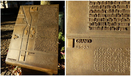 Captions and descriptions are typically expressed in Braille []. This well-known system, unfortunately, has several limitations related to tactile maps. Newman et al. [] describe the common size of each letter of 4 × 6 mm, but the standard size varies between countries as well as for different uses []. In all cases, Braille symbols need to be larger than non-relief fonts, and so the captions are abbreviated very often. Awareness of the existence of Braille is relatively good, but Braille literacy, even among those with severe visual impairment, is not unequivocal []. Still, a large number of visually impaired people do not use Braille and rely on modern technologies, e.g., Text To Speech (TTS) in mobile devices, providing simpler ways of obtaining information.
