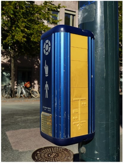 Consequently, methods other than Braille are often used for the transmission of information. The most common example is acoustic signaling at pedestrian crossings and special audio beacons activated remotely when a person with visual impairment enters the area. In some cases, the devices at the pedestrian crossings are supplemented by a simple tactile map. Figure 2 illustrates one of the pedestrian push-button systems developed by the Swedish company Prisma Teknik present in various models across a number of European cities [].