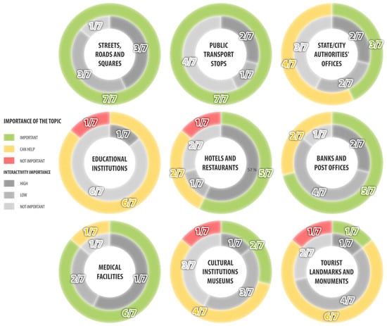 The highest demand for interactivity was noted in the case of medical facilities, restaurants, and hotels (mostly evaluated as highly important). Additionally, the interactive voice description of the street network, banks and post offices was found to be highly important compared to other categories. Map interactivity of tourist landmarks and monuments was mostly evaluated to have low importance, and the “not important at all to have the auditive description” was the most frequent response for the rest of POIs (Figure 5).
