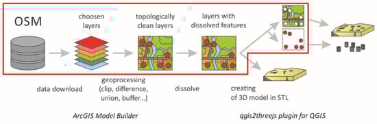 Based on findings from the user survey described in Section 2.2, a workflow for semi-automated creation of interactive tactile maps advancing the TouchIt3D technology was designed. The workflow includes obtaining geodata, the processing of that data, 3D modeling, the settings of printing parameters, the printing itself, and the preparation of a template for the mobile application. As there are conceptually different steps included, it is hardly imaginable to automate the entire workflow. In addition, some processes must be done specifically for each map and for each different 3D printer. Despite these challenges, several steps representing a consistent sequence of steps have been automated to make the design process more effective. Whole the process was divided into three blocks according to the primary environment of processing—the GIS block (Figure 6), the 3D modeling block, and the 3D printing block (Figure 10). Automated parts are marked in red in the subsequent schemes.