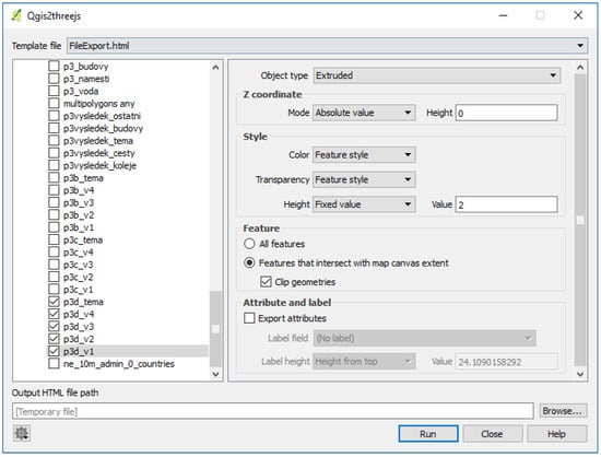 The source data for further processing originated in the OSM database covering the whole world, although the quality could differ across regions. Data were imported using the ArcGIS Editor for OSM plugin in ArcGIS for Desktop software [] and transformed into a UTM Zone 33N projection as the sample areas of interest were located in Czechia (the city of Ostrava and the town of Konice). In the following steps, all point and line features were converted into polygons which could be later extruded into 3D. Therefore, the layers were processed using geoprocessing tools into a topologically clean representation covering the entire area of interest. All of the layers were also cropped for the area of interest defined by a separate polygon layer.