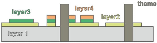 Layer distribution on an example map of Tourism type (layer 1 = streets, layer 2 = open spaces, layer 3 = forest and parks, layer 4 = buildings, theme = thematic layer of POIs).